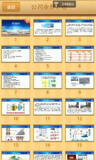 运行“挥秘手机客户端”应用之后进入的第一个界面为入下图所示的“幻灯片列表页面”,在该页面内将列出所有的可以使用的幻灯片。