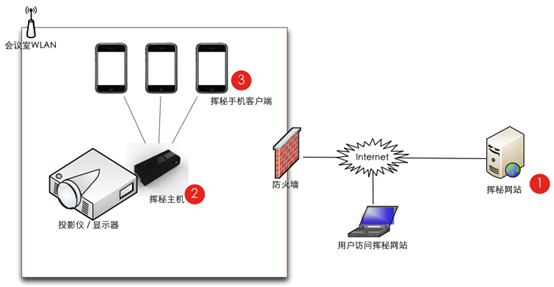 :挥秘主机上运行“挥秘投影仪端App”。将挥秘主机插入投影仪显示输入端口便组成了一个挥秘无线演讲环境,挥秘主机由东蓝数码自主研发(见附录II),其上运行有“挥秘投影仪”端App。说明:挥秘主机和运行挥秘手机客户端App的手机需要位于同一个WLAN中。