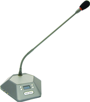话筒按钮带有红、绿双色发光指示灯,绿灯闪烁表示申请发言,红色常亮表示话筒打开