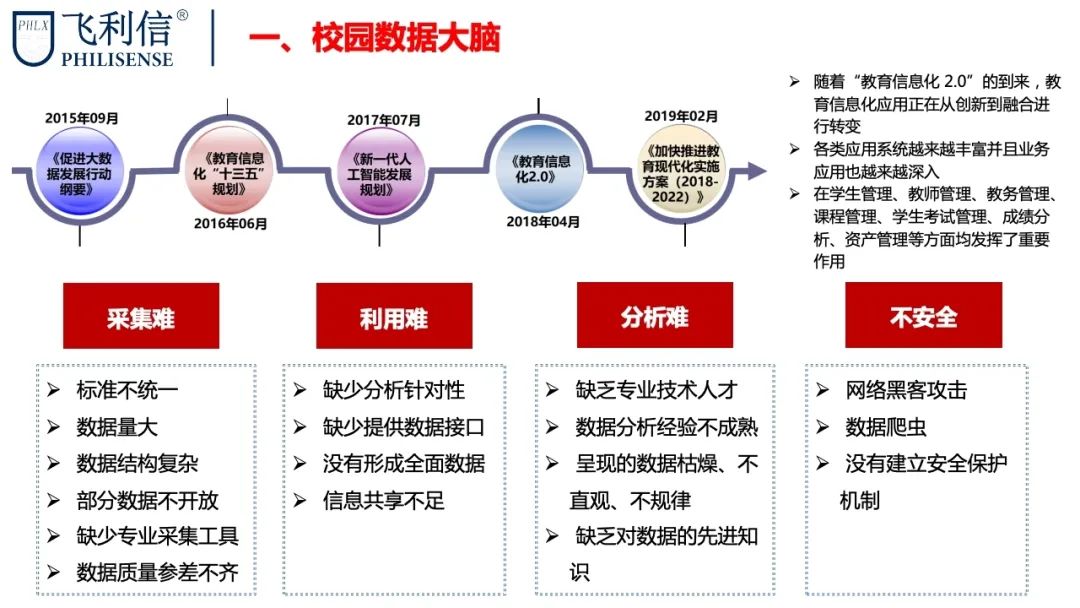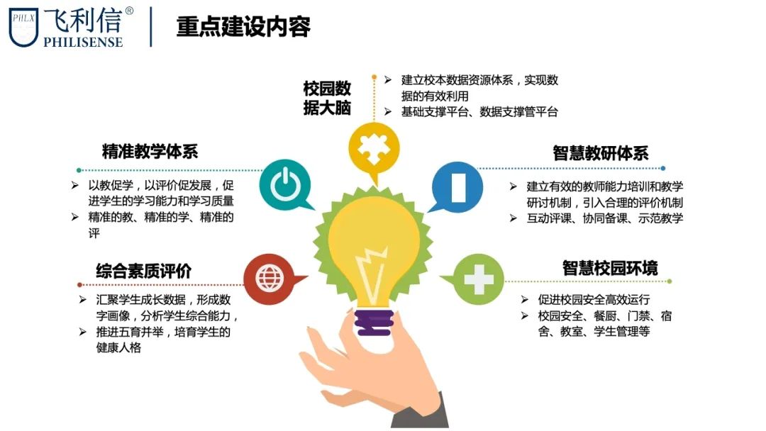 在教育信息化时代,飞利信认识到教育行业发生着重大变化,仅仅提供硬件设备已经远远不够,还要能够提供整合信息化的整体方案。当前,利用飞利信在智能化和大数据领域积累的技术优势,飞利信已经开发了智慧教室、智慧课堂和智慧校园等关键应用和平台。同时进一步打破边界在生态上全面开放、兼容并蓄,与软硬件生态合作伙伴一起推动教育向智能化和智慧化方向发展。
