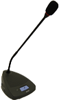 话筒按钮带有红、绿双色发光指示灯,绿灯闪烁表示申请发言,红色常亮表示话筒打开