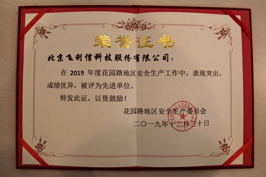飞利信一直是海淀区安全生产的重点单位,多年来,在区、街道上级安全部门的指导下,公司始终坚持贯彻“预防为主,防消结合”的方针,充分发挥主观能动性,完善工作制度,加强公司全员生产安全教育。飞利信成立二十二年来,公司生产安全工作从未出现事故,生产安全工作稳中有进。
