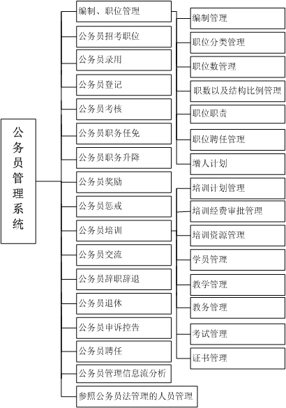 产品介绍 公务员管理系统由公务员业务职能管理和服务两大部分组成,其中业务职能管理主要包括公务员信息管理、公务员职位管理、公务员考核奖惩、公务员职务升降与任免、公务员工资福利保险、公务员辞职辞退管理、公务员退休管理、公务员聘任、公务员申诉控告,公务员交流与回避等子系统组成,公务员服务由公务员考试录用、公务员培训、公务员身份认证和公务员自助服务等子系统组成。