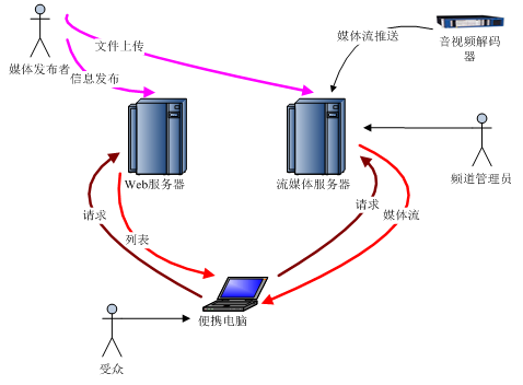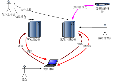 视频系统管理端 | 管理频道与视频内容信息,如会议现场频道、电视频道、个人视频中心等。也可以编辑视频内容信息,如重新编码、增加详细信息、设置关键播放点等等。 |