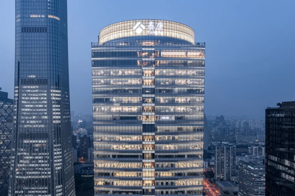泰康集团大厦雄踞北京CBD核心区,大厦以中国古代礼器“玉琮”为设计理念设计而成,充分融合了中国传统艺术与现代科技,形态简洁而平衡。傲立于天地之间的塔楼线条简洁匀称,立面的凹缝切分出四个相等的体量,凸显塔楼高度和居中对称性。大厦地上总建筑面积约14万平方米,由220米高的45层塔楼以及31.5米高的5层裙楼组成。