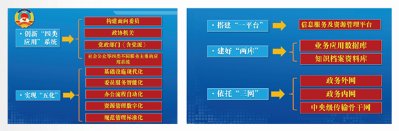 ·围绕行政体系结构,加强省政协与全国政协,省内各级政协,各级地方政府、法院、检察院之间的沟通协调,依托电子政务网络和基础信息资源库建立信息共享平台,与一府两院实现网络互联互通和资源共享。